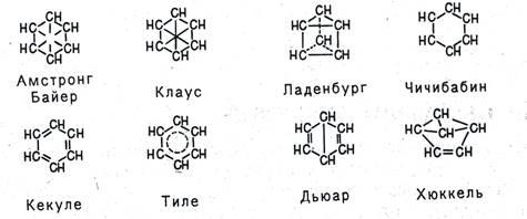 Пытаясь объяснить свойства бензола особенностями строения, многие ученые вслед за Кекуле выдвигали по этому поводу свои гипотезы. Поскольку непредельность бензола явно не проявлялась, считали, что двойных связей в молекуле бензола нет. Так, Армстронг и Байер, а также Клаус предположили, что в молекуле бензола четвертые валентности всех шести атомов углерода направлены к центру и насыщают друг друга, Ладенбург - что углеродный скелет бензола представляет собой призму, Чичибабин - что в бензоле углерод трехвалентен.