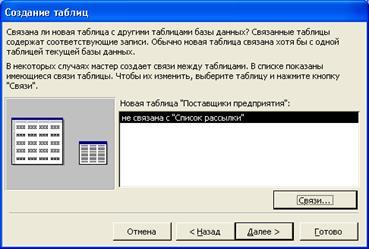 В следующем окне Мастер таблиц предлагает установить связи между существующими таблицами и создаваемой таблицей. Он пытается сам создать связи между таблицами и предоставляет информацию о создаваемых связях пользователю в виде списка. При необходимости исправить связи нужно выбрать соответствующую строку списка и нажать кнопку Связи. Например, выберите в списке строку не связана с "Клиенты" и нажмите кнопку Связи.