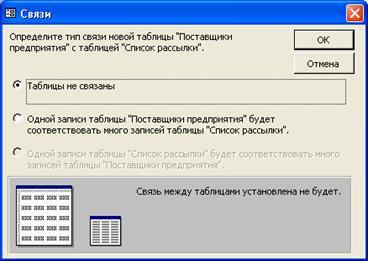 В окне Связи нужно выбрать тип связи с данной таблицей. Выберите переключатель Одной записи в таблице "Клиенты" будет соответствовать много записей таблицы "Список рассылки оповещений". Нажать кнопку ОК.