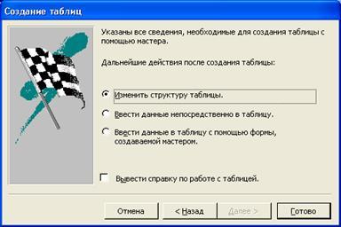 Открыв последнее диалоговое окно, можно решить, что вы будете делать с таблицей дальше. Выберите переключатель Изменить структуру таблицы, чтобы перейти в режим Конструктора таблиц, и нажмите на кнопку Готово. Откроется окно Конструктора таблиц.