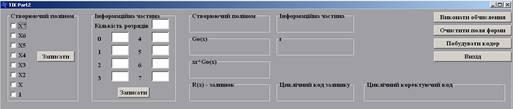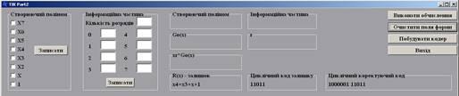 Наприклад, при введенні створюючого поліному і інформаційної частини таких, що були наведені в попередніх прикладах, після натискання кнопки "Виконати обчислення" матимемо у відповідних полях такі результати: