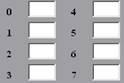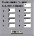 У вікнах пронумерованих від "0" до "7" вводиться задана в умові інформаційна частина, де "0"-"7" - номери відповідних розрядів інформаційної частини, починаючи з молодшого.