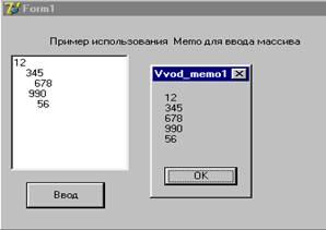 строк, разделенных последовательностью символов с кодами 13 и 10 (конец строки и переход на новую строку). Эти символы добавляются в поле Memo при нажатии клавши Enter. Для выделения подстроки, содержащей элемент массива, нужно найти символ с кодом 13 (#13), скопировать в новую подстроку, а затем удалить ее вместе с кодами 13 и 10 и продолжить поиск конца строки.