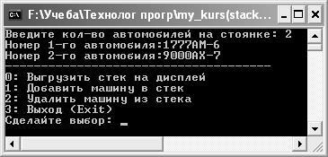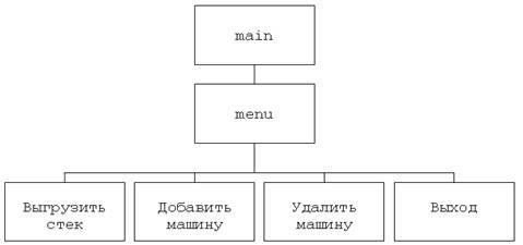 Menu – функция меню, выбор пункта меню. Выгрузить стек – выгружает стек на дисплей. Добавить машину - добавляет машину в стек. Удалить машину - удаляет машину из стека. Выход - выход из программы.