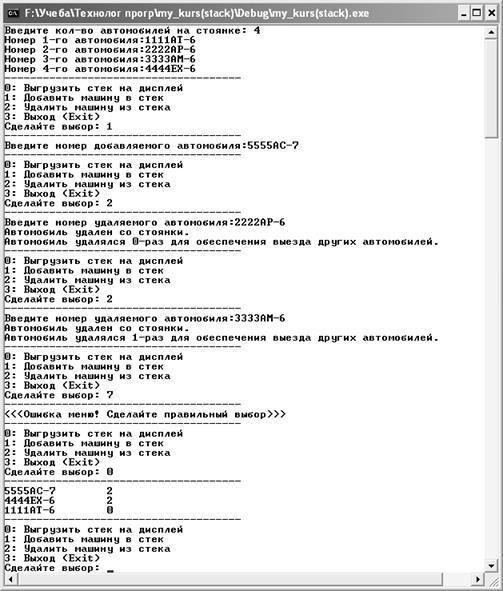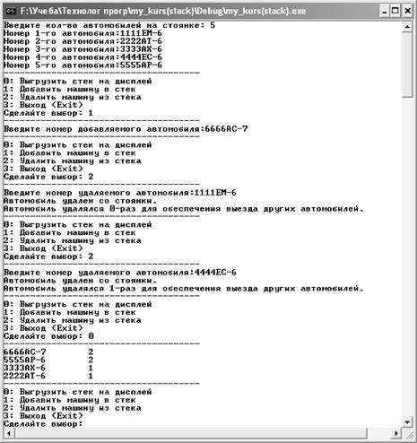 В данной курсовой работе необходимо создать шаблон класса "стек" и написать программу, использующую этот шаблон класса для моделирования процесса прибытия и отъезда машины со стоянки. Программа формирует начальный стек. Далее с помощью меню пользователю предоставляется возможность сделать выбор – выгрузить стек на дисплей, добавить машину, удалить машину, выйти из программы. Для того чтобы выгрузить стек была создана функция pop(), а для добавления машины функция push(). Удаление машины из стека (гаражная стоянка) осуществляется путем выборки элементов стека (машин и информации о кол-ве выездов) и занесением их в вспомогательный стек temp, до тех пор, пока не будет найден удаляемый элемент (автомобиль). После чего элементы с вспомогательного стека заносятся обратно в том же порядке в начальный стек, при этом количество выездов увеличивается на 1. Таким образом, мы удаляем нужный нам автомобиль и ведем подсчет количеству раз, которое машина удалялась со стоянки. Если машина, которую мы хотим удалить, не найдена, программа выдаст соответствующее сообщение.