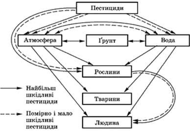 Людина, як частина трофічного ланцюга, складова частина екосистеми і гетеротроф, уже давно не задовольняється існуючими трофічними зв'язками, їх масштабами і створює штучні біоценози, більш продуктивні, ніж природні. Так, при розорюванні земель фітоценози (природні рослинні угруповання) змінюються штучними – агрофітоценозами. В них складаються якісно інші трофічні зв'язки. Природний процес зміни рослинності змінюється штучним і йде не від природи, а від людини – у зворотному напрямі. При цьому нагромаджується багато відходів, що не характерне для природної трофіки. В таких випадках людина стає ніби чужою складовою частиною природи, виходячи із загального біогенного кругообігу. В результаті її діяльності створюється інший екологічний комплекс, який істотно порушує природні біоценози й екосистему. Це, зокрема, можна спостерігати в сівозмінах, де застосовують технології вирощування культур, що передбачають внесення в ґрунт і на посівах великої кількості різних хімікатів, які в подальшому циркулюють у біосфері, що можна проілюструвати на прикладі пестицидів (рис. 1). Здебільшого вони згубно діють на рослини і ґрунтову біоту, природну трофіку. Створюються агробіоценози із зруйнованими зворотними зв'язками. Екологічні умови на таких полях різко погіршуються, продукція містить внесені хімічні сполуки. Ферментативна система рослин не розкладає і не виводить їх з кореневими виділеннями, а тому вони накопичуються в рослинах.