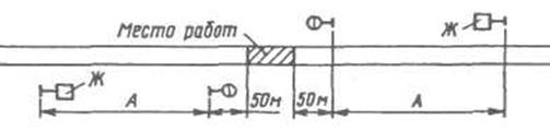 Места производства работ на перегонах, требующие следования поездов с уменьшенной скоростью, ограждаются с обеих сторон на расстоянии 50 м от границ участка работы переносными сигнальными знаками "Начало опасного места" и "Конец опасного места". От этих сигнальных знаков на расстоянии А (рис. 2) устанавливаются переносные сигналы уменьшения скорости.