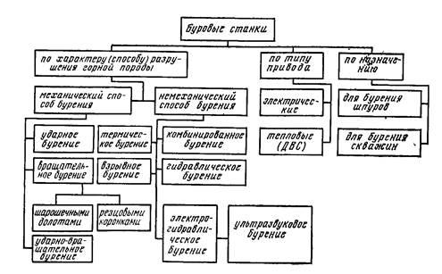 Буровые станки классифицируются по характеру (способу) разрушения горной породы, типу привода и назначению (рис. 1).