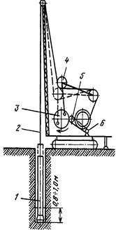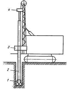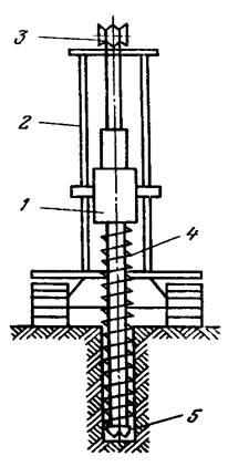 Станки вращательного бурения резцовыми коронками (рис. 3) имеют вращатель 1, своими лапами скользящий по вертикальным направляющим 2. Подъем вращателя производится лебедкой с помощью подъемного каната, образующего полиспаст 3. В патроне вращателя укрепляется шнековая штанга 4 с прикрепленной к ней коронкой 5. Разрушенная порода удаляется из скважины на поверхность шнеком.