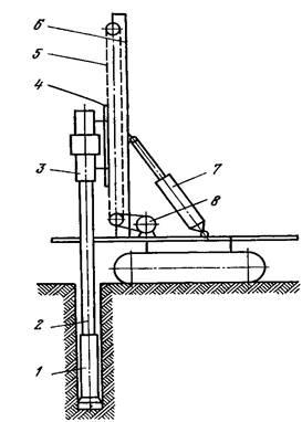 Бурение станками ударно-вращательного бурения основано на комбинированном способе разрушения породы, объединяющем основные достоинства ударного и вращательного воздействия на породу. Отличительной особенностью этих станков является наличие погружного ударного механизма — пневмоударника / (рис. 5). Пнев-моударнику через штанги 2 передается вращение от вращателя 3, установленного на плите 4. Подача бурового става йа забой и создание осевого усилия осуществляются с помощью подающего механизма 5. Вращатель перемещается по мачте 6> изменение угла наклона которой осуществляется гидроцилиндром 7.