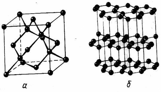 Грани, рёбра и вершины кристаллов связаны зависимостью: число граней + число вершин = число рёбер + 2. В большинстве случаев кристаллические вещества не имеют ясно огранённой формы, хотя и обладают закономерным внутренним кристаллическим строением. Установлено, что кристаллы построены из материальных частиц - ионов, атомов или молекул, геометрически правильно расположенных в пространстве. Основные свойства кристаллических веществ следующие: 1.Анизотропность (т.е. неравносвойственность).Анизотропными называются такие вещества, которые имеют одинаковые свойства в параллельных направлениях, и неодинаковые - в непараллельных. Различные физические свойства кристаллов, такие, как теплопроводность, твердость, упругость, распространение света и др., изменяются с изменением направления. В противоположность анизотропным, изотропные тела имеют одинаковые свойства во всех направлениях. 2.Способность самоограняться.Этой специфической особенностью обладают только кристаллические вещества. При свободном росте кристаллы ограничиваются плоскими гранями и прямыми рёбрами, принимая многогранную форму. 3.Симметрия. Симметрией называется закономерная повторяемость в расположении предметов или их частей на плоскости или в пространстве. Все кристаллы являются телами симметричными.Структура кристалла, т.е. расположение в нём отдельных частиц, является симметричной. Следовательно, и сам кристалл будет обладать плоскостями и осями симметрии. Материальные частицы (атомы, ионы, молекулы) в кристаллическом веществе размещаются не хаотично, а в определённом строгом порядке. Они расположены параллельными рядами, причём расстояния между материальными частицами этих рядов одинаковы. Эта закономерность в строении кристаллов выражается геометрически в виде пространственной решётки, являющейся как бы скелетом вещества. Представить пространственную решётку можно как бесконечно большое число одинаковых по форме и размеру параллелепипедов, сдвинутых относительно другого и сложенных так, что они выполняют пространство без промежутков.Вершины параллелепипедов, в которых находятся атомы, ионы или молекулы, называются узлами пространственной решётки, а прямые линии, проведённые через них, - рядами. Любая плоскость, которая проходит через три узла пространственной решётки (не лежащих на одной прямой), называется плоской сеткой. Элементарный параллелепипед, в вершинах которого находятся узлы решётки, носит название ячейки данной пространственной решётки. Таким образом, кристаллическое вещество имеет строго закономерное (ретикулярное) строение. На приведенном ниже рисунке можно увидеть кристаллические решетки: а) - Алмаза, б) – графита. Все важнейшие свойства кристаллических веществ являются следствием их внутреннего закономерного строения. Так, например, анизотропность кристаллов можно легко уяснить, если вести измерение каких-либо свойств в различных направлениях. Особенно чётко анизотропия выявляется в оптических свойствах кристаллов, на чём основан один из важнейших методов их изучения, применяемый в минералогии и петрографии. Способность кристаллов самоограняться также является естественным следствием их внутреннего строения. Грани кристаллов соответствуют плоским сеткам, рёбра - рядам, а вершины углов - узлам пространствен