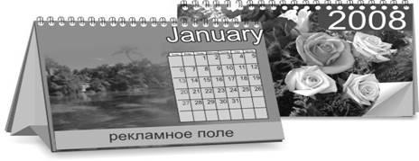 Дизайн календаря. Оформление каждого вида фирменного рекламного календаря имеет свои особенности. Большие визуальные образы, объединенные общей идеей, нестандартное оформление календарной сетки, возможность вырубки, тиснения, выполнения верха календаря из дизайнерского картона, все это поможет сделать настенный перекидной календарь эффектным и имиджевым фирменным рекламным изделием. В квартальном календаре основное внимание уделяется целостности общего вид а календаря. Для удешевления стоимости обычно берутся готовые стандартные календарные блоки, отпечатанные заранее в одной из крупных типографий большим тиражом (сотни тысяч или даже миллионы экземпляров). Они могут быть разными по плотности и качеству бумаги, а также по цветам, что позволяет выбрать подходящий вариант в каждом конкретном случае. Иногда под определенные задачи необходимо напечатать уникальные блоки, при этом цифры на блоках квартальных календарей делают достаточно большими, чтобы их легко можно было различать с некоторого расстояния. Проволока, для скрепления календаря, имеет стандартные цвета. Самые распространенные цвета - это белый, черный и серебряный, имеется также проволока синего, красного, желтого, зеленого и золотого цвета. Пикколо чаще всего делают золотого или серебряного цвета, но бывают также черные, зеленые, красные, белые и желтые колечки пикколо. Стандартные курсоры красного цвета, возможные дополнительные цвета: синий и зеленый.