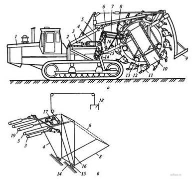 В трансмиссию тягача включен гидромеханический ходоуменьшитель для бесступенчатого регулирования рабочих скоростей движения машины при копании траншей. На тягаче установлена дополнительная рама 2 с размещенными на ней механизмами привода 7и подъема-опускания рабочего органа. Рама имеет две наклонные направляющие 14, по которым с помощью пары гидроцилиндров 3 и двух пластинчатых цепей 4 гидравлического подъемного механизма перемещаются ползуны 15 переднего конца рамы 8 рабочего органа при переводе его из транспортного положения в рабочее и наоборот. Подъем-опускание задней части рабочего органа (рис. 1, б) осуществляются парой гидроцилиндров 5, штоки которых шарнирно прикреплены к верхней части стоек 16, связанных с задним концом рамы 8 цепями 6. При копании траншеи задняя часть рабочего органа находится в подвешенном состоянии Установка откидной части ленточного конвейера в наклонное рабочее положение и опускание ее при транспортировке машины производятся гидроцилиндром 19 через полиспаст 17 с траверсой 18. Изменением угла наклона откидной части конвейера достигается различная дальность отброса грунта в сторону от траншеи.
