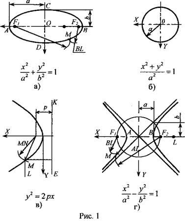 Если кривая линия совмещается всеми точками с плоскостью, ее называют плоской. Порядком плоской алгебраической кривой считают максимальное число точек ее пересечения с прямой линией. К плоским кривым относятся все кривые второго порядка, подробно изучаемые в аналитической геометрии. На рис. 1 показано построение этих кривых и приведены их канонические уравнения.