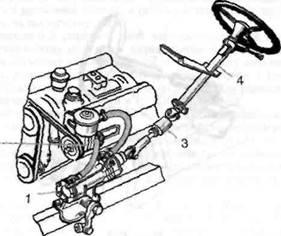/ — рульовийй механізм, 2 — гідронасос; 3 — кярданний вал; 4 — рульова колонка