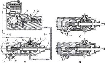 Положення деталей гідропідсилювача (рис. 1.3,а) відповідає прямолінійному рухові автомобіля. В цьому разі олива перекачується Насосом через клапан керування, оскільки нагнітальний трубопровід 5 сполучається зі зливальним 13 через золотник 7, що займає середнє положення під дією пружин реактивних плунжерів 8 і тиску оливи. Надлишкового тиску в порожнинах А і Б гідропідсилювача помає.