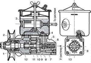 Насос гідропідсилювача (рис. 1.4) лопатевого типу приводиться в дію від шківа колінчастого вала двигуна клинопасовою передачею через шків 2, закріплений на валу 12 насоса. Вал обертається на кульковому й роликовому підшипниках у корпусі 1 насоса. На шліцьовому кінці вала закріплено ротор 10,