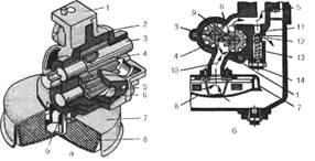 (рис. 5) дизеля СМД-60 складається з нерухомої і рухомої (ротора) частин і змонтована в корпусі 1 (рис. 5, б). В корпус 1 вкручено пустотілу вісь 6 з нижньою 31 і верхньою ЗО опорними шийками. На осі нерухомо (за допомогою гайки 10) закріплюється захисний ковпак 12, а ротор – з можливістю обертання відносно осі і вісьовим переміщенням 0,2–0,6 мм за допомогою гайки 8, упорної шайби 9 і гайки 11. Між ковпаком 12 і корпусом 1 встановлюється ущільнювальна паронітова прокладка 15.