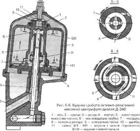 Рис. 5. Будова (а, б) і робота (в) реактивної масляної центрифуги: