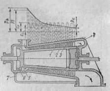 Схема работы пара в многоступенчатой реактивной турбине дана на рис. 6. Турбина состоит из корпуса 4, в котором укреплены неподвижные направляющие лопатки 3, и ротора 2, на котором размещены подвижные рабочие лопатки 1. Пар давлением р0