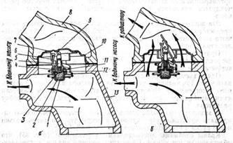 а - термостат в закрытом положении; б - термостат в открытом положении; 1 - баллон термостата; 2 - активная масса (церезин); 3 - мембрана; 4 - направляющая втулка; 5 - шток; 6 - возвратная пружина; 7 - заслонка термостата; 8 - верхний патрубок; 9 - коромысло заслонки; 10 - корпус термостата; 11 - буфер; 12 - рант; 13 - нижний патрубок.