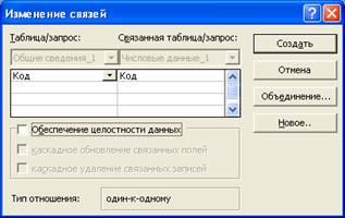 Добавляем две указанные таблицы и нажимаем кнопку «ОК». В окне схемы данных появляются списки полей двух таблиц. Методом протаскивания помещаем ключевое поле одной таблицы на ключевое поле другой. Аналогично с остальными таблицами. На экране появляется окно «Изменение связей». Ставим галочку в окне «обеспечение целостности данных» и «каскадное обновление связанных полей».