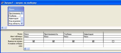 В запросах заходим в конструктор и добавляем графу «реки» и « области». Перетаскиваем в графу поле «глубину», «реку» «область» и «код области». В графе «Область-условие отбора» пишем 2 .Нажимаем Запрос - обновление. В нижней таблице появляется новая графа «обновление». В графу «глубина-обновление» вводим [глубина]*0,35.