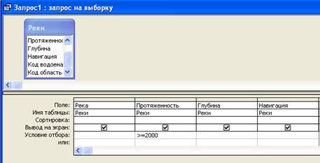 Запрос на выборку позволяет вывести на экран таблицы, содержащей сводные данные по какому-либо критерию отбора. Из таблицы Реки необходимо выбрать реки, протяженность которых более 2000. В окне базы данных необходимо выбрать объект «Запросы» и дважды щелкнуть на значке «Создание запроса в режиме конструктора». Откроется окно «Запрос на выборку». Также открывается диалоговое окно «Добавление таблицы», в котором в качестве источника данных для запроса выбираем Реки, а затем щелкаем на кнопке «Добавить». Далее необходимо перетащить имена полей таблицы (или таблиц) из верхней части бланка запроса в его нижнюю часть (в строку «Поле»), тем самым, осуществив выбор полей, включаемых в результирующую таблицу. Критерии поиска задаются в строке Реки. Для вывода в результирующей таблице списка протяженности рек необходимо в ячейку строки «Условие отбора» поля протяженность рек ввести критерий выбора: >=2000.