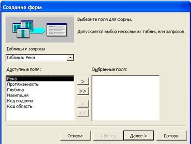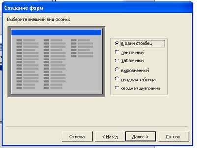 Возможно также создание форм с помощью мастера форм. В окне «Создание форм» выбираем доступные поля и нажимаем на кнопку «Далее». В следующем окне «Создание форм» выбираем тип формы и щелкаем на кнопке «Готово».