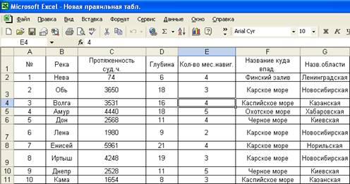 В ячейки А1 – G1 вводим соответственно: порядковый номер, название реки; протяженность судоходной части; глубина фарватера; количество месяцев навигации в году; название водоема, куда река впадает; название области, где река располагается. Выделяем эти ячейки и выполняем команду «Формат – Ячейки – Выравнивание». В окне «Выравнивание» устанавливаем тип: по горизонтали – по центру; по вертикали – по центру; и устанавливаем флажок параметру «Перенос по словам». Затем изменяем ширину столбцов.