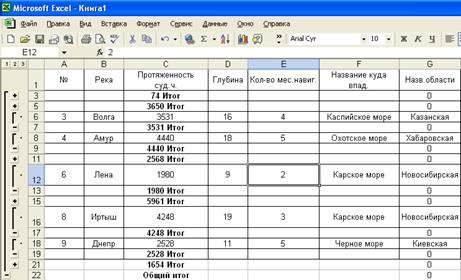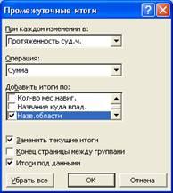 Чтобы вычислить суммарную протяженность рек по областям, необходимо ввести курсор в пределы таблицы, затем выполнить команду «Данные-итоги», появляется окно: