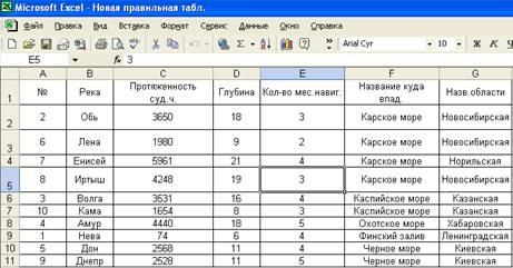 2.Далее необходимо сформировать список рек, впадающих в выбранный пользователем водоем. Вводим курсор в пределы таблицы и выполняем команду «Данные – Фильтр – Автофильтр». После этого в каждой ячейке заголовка столбцов появится кнопка раскрывающегося списка. Щелкаем на кнопке поля и из появившегося списка выбираем интересующий нас водоем. Например, Карское море.