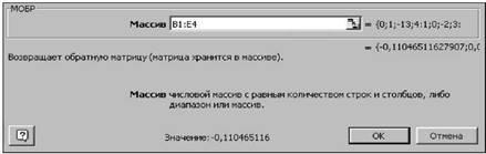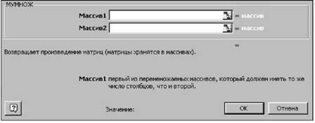 Обратите внимание на особенность работы с матричными формулами: необходимо предварительно выделять область, где будет храниться результат, и после получения результата необходимо преобразовать его к матричному виду, нажав клавиши F2 и Ctrl+Shift+Enter.