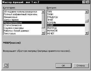 В нашем случае матрица А находится в ячейках B1:Е4, а вектор b -G1:G4. Сначала решать систему будем методом обратной матрицы. Поэтому необходимо вычислить матрицу, обратную A. Для этого выделим ячейки для хранения обратной матрицы (это нужно сделать обязательно!!!); пусть в нашем случае это будут ячейки B6:E9. Теперь обратимся к мастеру функций, и в категории Математические выберем функцию МОБР (функция для вычисления обратной матрицы) (см. рис. 22), и, щелкнув по кнопке OK (Excel 97,2000,XP) или Шаг > (Excel 5 или Excel 7), перейдём ко второму шагу мастера функций. Затем необходимо выделить на рабочем листе исходную матрицу, или просто ввести интервал (в нашем случае B1:E4), где хранится матрица, в качестве параметра в функцию МОБР (см. рис.23).
