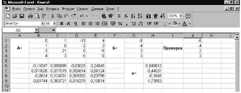 Осталось сделать проверку. Умножим матрицу A на полученный вектор x и проверим, получится ли вектор b. Умножение матрицы A на вектор x осуществляется аналогично описанной выше процедуре. В результате наш рабочий лист будет иметь вид (см. рис. 26).