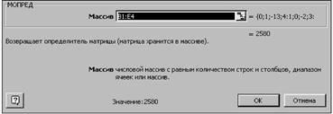 Теперь необходимо вычислить определители матриц A, A1 ,A2 ,A3 и A4. Определители в нашем случае будем хранить в ячейках I10-I14. Переведём курсор в ячейку I10 и обратимся к мастеру функций. В категории Математические выберем функцию МОПРЕД (это функция вычисления определителя матрицы), перейдём ко второму шагу мастера функций (см. рис. 28). В качестве параметра Массив укажем интервал B1:E4, где хранится матрица A. В ячейки I11-I14 просто введем соответствующие формулы