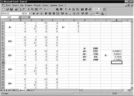 Теперь рассмотрим, как можно решить эту же систему методом Крамера. Введём матрицу А и вектор b на второй рабочий лист. Кроме того, сформируем четыре матрицы из матрицы A заменой соответствующего столбца вектором b. Рабочий лист примет следующий вид (см. рис. 27).