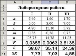 Вычисление значения F для двух других наборов данных произойдет автоматически, если формулу из ячейки В9 скопировать в ячейки С9 и D9. Сумма и среднее значение будет вычислено, если в ячейки В10 и В11 ввести следующие формулы: =СУММ(B4:B8) и =СРЗНАЧ(B4:B8).