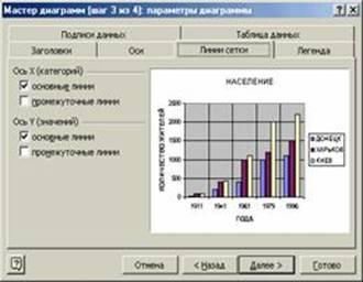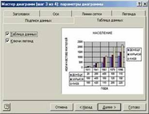 На этом шаге вы должны выбрать тип и вид диаграммы и перейти к следующему перейти к следующему шагу построения графика, щелкнув по кнопке Далее> (см. рис. 17). или щелкнув по кнопке Готово и пропустив все остальные шаги (они будут выбраны по умолчанию) завершить построение графика.