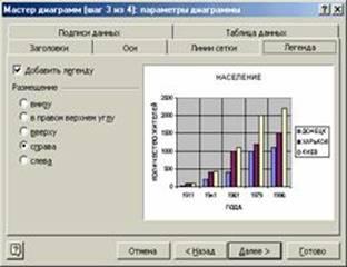 На этом шаге вы можете с помощью мышки выделить другую область для построения графика или для конкретного ряда данных (вкладка Ряд). Здесь же можно определить имя легенды (поле Имя). На следующем шаге мастера диаграмм необходимо будет определить параметры диаграммы: заголовки, подписи осей, легенду (см. рис. 18) и т. д.