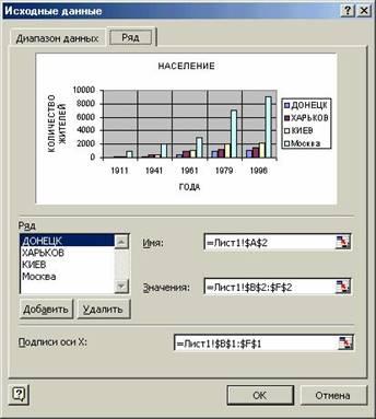 Щелкнуть правой кнопкой мышки и выбрать команду Исходные данные, появиться окно мастера диаграмм (см. рис. 20) . В этом окне можно добавлять новые ряды данных (кнопка Добавить) и удалять уже существующие (кнопка Удалить).
