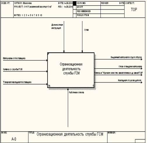 Третьей функцией является выдача материала по заявке в службу ГСМ. Входом является сама заявка, которая приходит из отдела отпуска авиа-ГСМ. Выходом служит следующее: выданный по заявке материал, сообщение о том, что в службе ГСМ отсутствует что-то из списка, который содержался в заявке. Сначала работник службы ГСМ получает заявку из отдела отпуска, а затем уже он начинает собирать материал по заявке. Результатом этого будет переданный в службу ГСМ материал и, в случае необходимости, содержащие информацию сообщение о тех материалах, которых не оказалось в наличии.