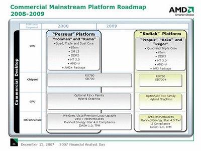 В данном случае компания пошла по проверенному её соперницей пути и планирует представить нечто похожее на платформу Intel vPro. На первых порах, впрочем, AMD не имеет возможности выпустить специальным образом доработанный системный чипсет, как это для ниши корпоративных систем сделала Intel.Чипсеты Intel с индексом Q (965Q, Q35 и т.д.), напомним, поддерживают Trust-модули для организации доверенных вычислений и технологию удалённого администрирования AMT, как и несколько других уникальных технологий. В будущем AMD планирует выпустить аналогичное решение. По всей видимости, сейчас оно скрывается под названием SB700+. Но мы забегаем вперёд. Начнём с того, что в первом квартале 2008 года AMD представит первую корпоративную платформу под кодовым именем Perseus.Офисные платформы AMD. Планы на 2008-2009 годы."Персей" объединит в себе все 65-нм процессоры архитектуры K10 с упором на трёхядерные Toliman и двухядерные Kuma, интегрированный чипсет RS780 с южным мостом SB700 и опционально видеокарты поколения R6xx. В последнем случае гарантируется включение режима Hybrid Graphics – совместная работа интегрированного и дискретного видеоядер. По предварительным тестам, кстати, на младших решениях эффект прироста производительности от Hybrid Graphics достигает 40%.Пока всё вышеперечисленное один в один совпадает с описанием массовой домашней платформы Cartwheel (см. новость выше). Теперь о различиях. Платформа Perseus будет поддерживать две уникальных технологии: DASH – открытый аналог технологии Intel AMT (Advanced Management Technology) разрабатываемый группой DMTF (Distributed Management Task Force) индустриального альянса DMWG (Desktop Mobile Work Group); и Trusted Platform Module – модули и расширения одноимённой индустриальной группы занимающейся безопасными вычислениями.