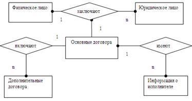 Если контрагент заключает не один а несколько договоров, то остальные договоры (все, кроме одного первого ) заносятся в базу дополнительных договоров. Если контрагент заключает новый договор и при этом не вышел срок действия старого, то он заносится в базу дополнительных договоров, иначе старый договор удаляется и новый добавляется в базу основных договоров. Один контрагент может заключать множество договоров, но не наоборот. Контрагентом может являться физическое лицо(один человек), либо юридическое лицо(предприятие). Исполнителем так же может быть физ. лицо, либо юрид. лицо. Контрагент не может заключить дополнительный договор, если он не заключил основного. Информация об исполнителе не может существовать без основного договора. Информация о контрагенте не может существовать без основного договора.