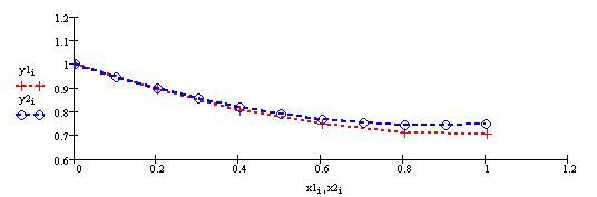 При решении задачи с шагом h=0.1 назовем шаг h2, аргумент - x2, а решение - y2.