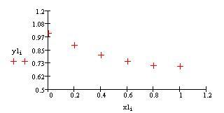 Для того чтобы построить график приближенного решения, щелкните в панели Graph по пиктограмме декартова графика, введите в помеченной позиции возле оси абсцисс имя первого столбца матрицы Y, содержащего значения x в узлах сетки, а в позиции возле оси ординат - имя второго столбца, содержащего значения приближенного решения в узлах сетки; затем щелкните по свободному месту в рабочем документе вне поля графиков.