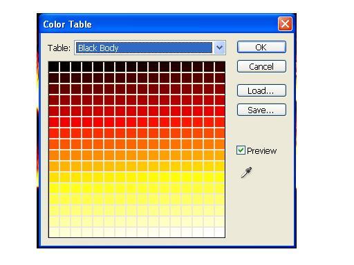 11. перевести изображение в режим индексированных цветов: Image – Mode – IndexedColor. После этого сопоставить полутоновому изображению цветовую модель. Для пламени подходящей будет команда Image – Mode – ColorTable.