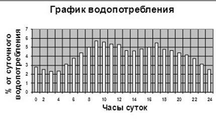 По поселку и предприятию наибольшее водопотребление происходит с8 до 9 ч., в это время на все нужды расходуется 574,3 м3