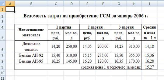 6. Выполняем расчет средней цены 1 л горючего за месяц: в ячейку I9 вводим формулу =СУММ(