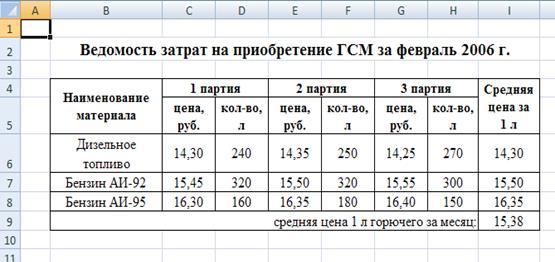 на основании исходных данных необходимо рассчитать среднюю цену 1 л. топлива по каждому виду за месяц, а также за квартал 2006 г., сформировать и заполнить сводную ведомость затрат на приобретение топлива за квартал и представить полученные данные в графическом виде.